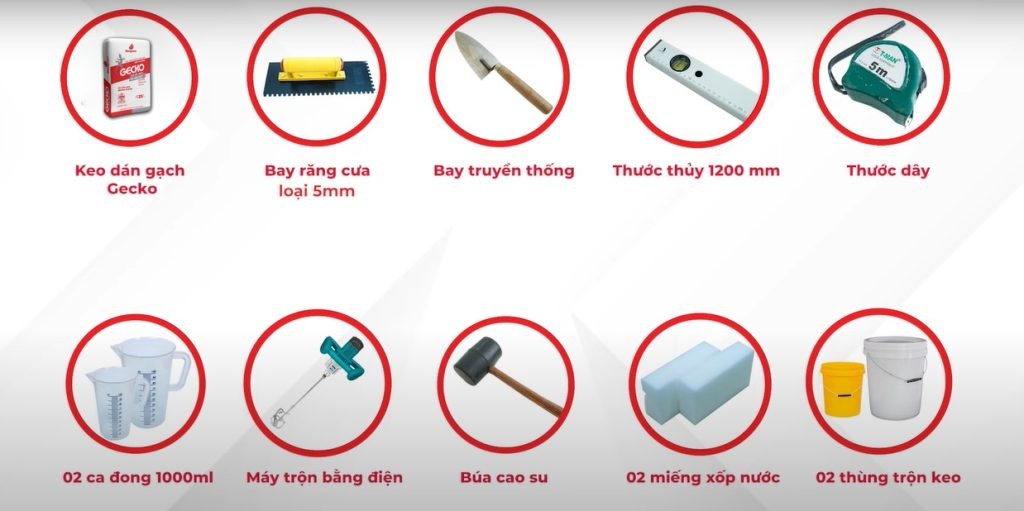 - Dụng cụ bao gồm: Xô hoặc thùng sạch, cân đong nước, máy trộn tay, bay răng cưa, bay thường, thước dây, ni vô, búa cao su hoặc bay cao su (trong trường hợp dán Mosaic).
